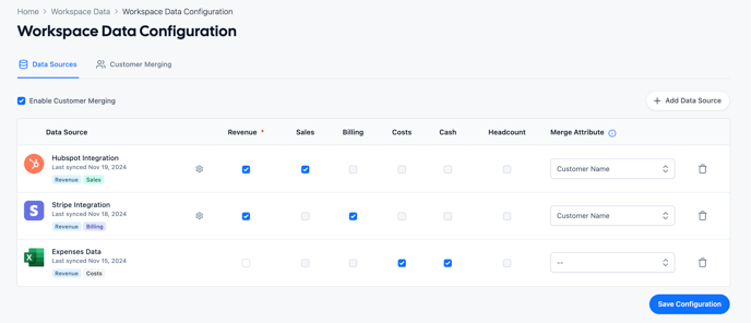 Workspace data sources can be configured in the menu shown below, where admins can select which data sources map to which data categories in SaaSGrid.