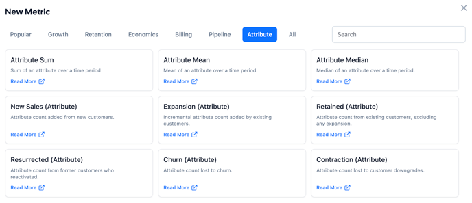 SaaSGrid has several custom attribute calculation options, currently limited to numerical attributes (i.e. text attributes will not be calculated). Numerical attributes can be added to SaaSGrid charts with sum, mean, and median available for calculation. Click on Attribute Mean to create a custom attribute metric that will calculate the average of any attribute across a time period.