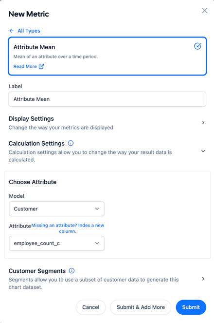 Under Calculation Settings, specify the metric that needs to be averaged. First, select the model of the attribute: this can be at the customer-level, deal-level, or any other data model that SaaSGrid has created. Second, select the attribute in the dropdown. If you do not see your metric, you can click on Missing an attribute? Index a new column. to add in a new attribute metric, or check if the attribute is on another model (e.g. a customer-level attribute instead of a deal-level attribute). Click Submit to generate the chart.