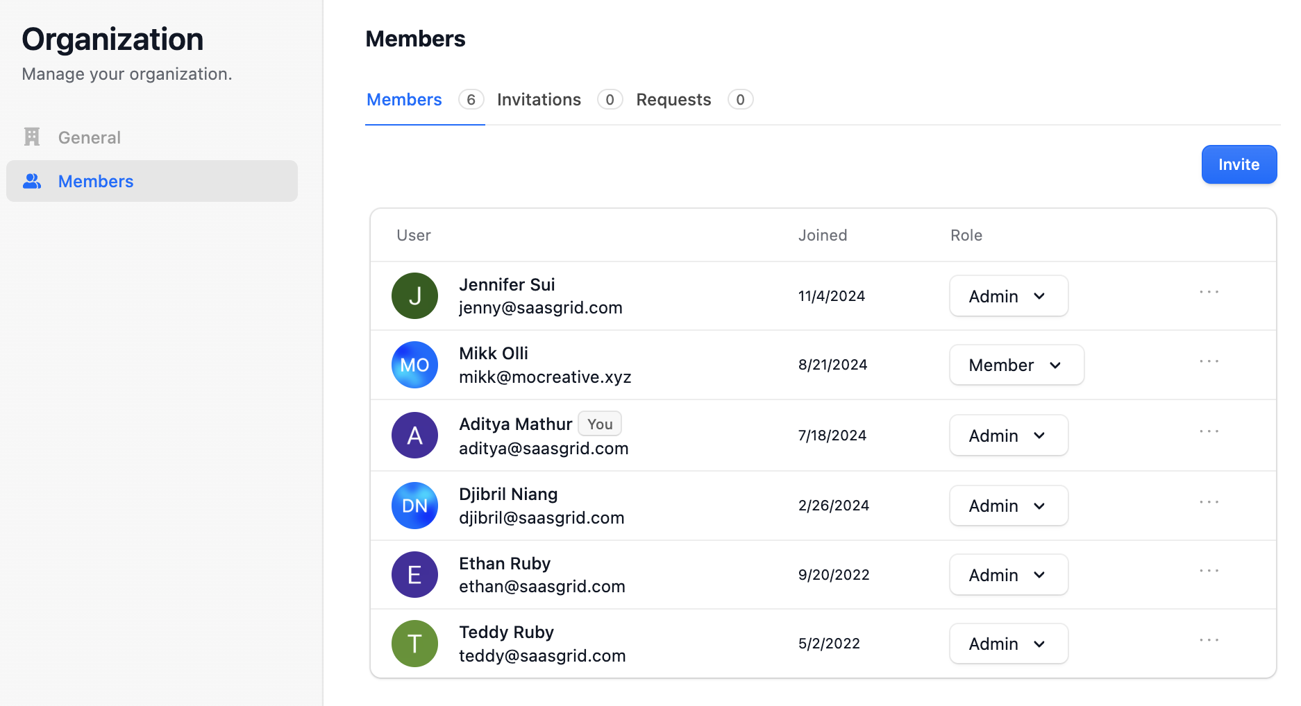 Under the Members tab in the window, you can see a complete list of all users in the organization and their role. In the Invitations tab, you can see all pending invites for users to join the organization. In the Requests tab, you can connect an email domain for automatic suggestions and review user requests to join your Organization.