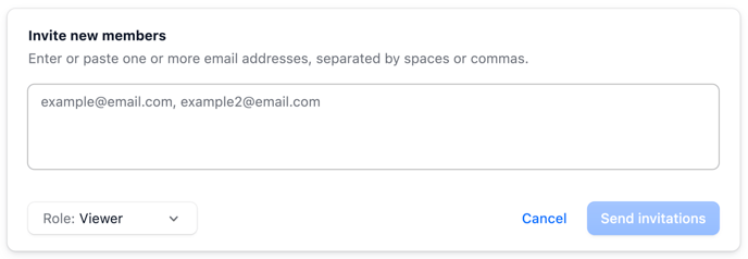 Clicking on Invite in the top right corner will open a menu to invite users. Enter email addresses and select the role for those users. When finished, click on Send invitations.