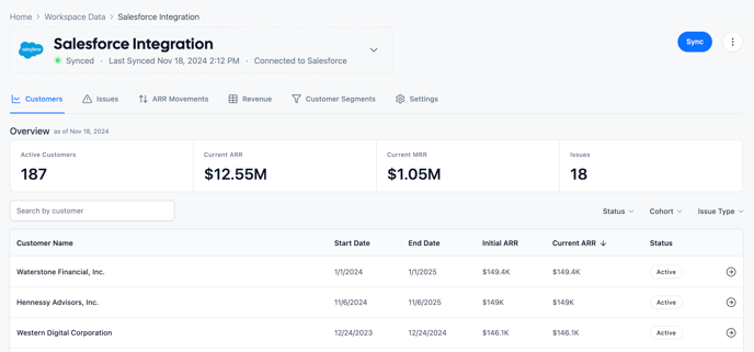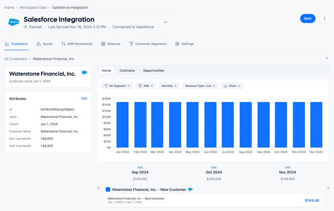 Clicking on a customer name leads you to the Customer Detail Page. You can view the evolution of their ARR, as well as the Start and End Dates for each new Contract, Amendment, and Renewal. At the top, you see their Salesforce Account ID and additional attributes.