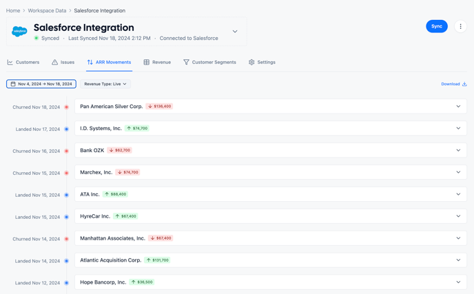 Under ARR Movements, you can see the latest updates to your customer base with a list of recent deals. Users can change the data range to track revenue movements and toggle between live and contracted ARR.