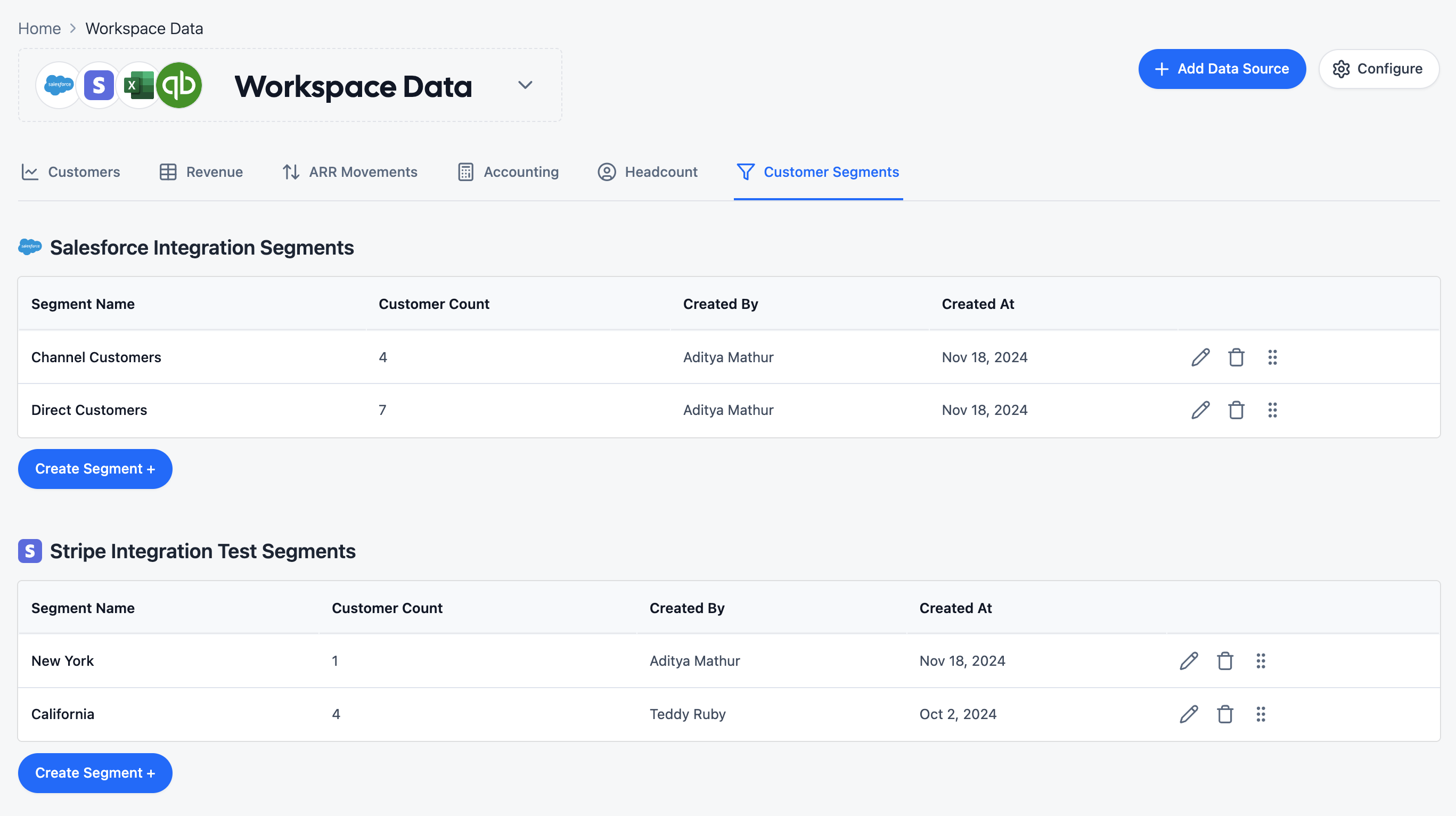Each Data Source has its own page. For CRMs, you can look through your customer and revenue information, be informed of any issues in your data, create and view Segments, and adjust your settings.